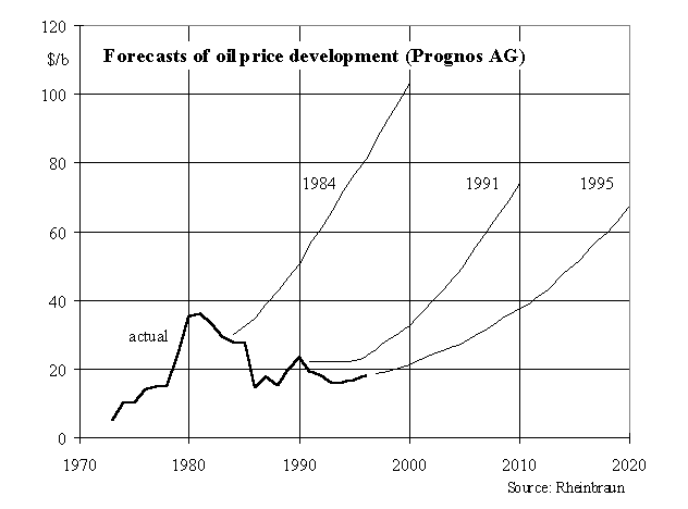 Fig. 1Another moving target, which is critical to the competitiveness of PV, is the availability and the price of crude oil. According to professional predictions in the 80s the price of a barrel of oil should already have crossed the 100 US $ barrier. We all know, that today OPEC is trying very hard to bring this price back up to at least 20 US $ per barrel. (Fig. 1)