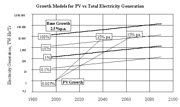 We, at Siemens Solar, are planning with 15 % and dreaming of 25 %. A growth rate of between 15 and 25 % in annual shipments would make PV a one percent contributor to the world electricity generation between the year 2025 and 2040. This means, that little quantitative competition for fossil or nuclear power stations will come from PV for the next decades.