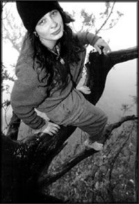 On December 10, 1999 Julia Butterfly Hill, 25, had reached her two year mark of sitting high atop the 600+ year old redwood tree now known as Luna. She climbed 180' up into a tarp covered 6' x 8' platform on December 10, 1997, in an effort to protect Luna and the hillside on which it stands, as well as to protest the federally brokered Headwater's Forest Agreement and the destructive and illegal logging practices of the MAXXAM/Pacific Lumber Company. Butterfly had called for permanent protection of all remaining old-growth forests and critical habitat for endangered species. "Things of real value in life are worth going to any length in love and respect to safeguard," said Butterfly. Julia had maintained her vigil with the assistance of a dedicated support group that brought her food, water, supplies and mail.